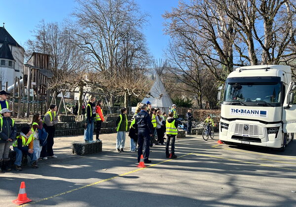 Im März besuchten unsere 4.-6. Klässlerinnen im Rahmen der Verkehrsinstruktion einen Informationsanlass zum Thema "toter Winkel". Anschaulich und imposant erklärten die Verkehrsinstruktorinnen der Kantonspolizei anhand eines parkierten LKWs, auf welche Gefahren besonders zu achten sind.