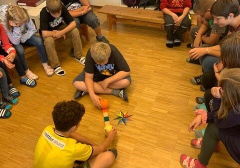 Am Dienstagvormittag der ersten Schulwoche versammelten sich alle Kinder und Lehrpersonen, um das neue Schuljahr gemeinsam zu eröffnen. Neben neuen Lehrpersonen und den neuen Kindergartenkindern wurde auch das Schuljahresthema 21_22 eingeführt. Anhand der Bildergeschichte "EINER für ALLE - ALLE für EINEN" wurden wichtige Werte im Zusammenleben aufgezeigt. Während dem ganzen Schuljahr wollen wir den Fokus immer wieder auf unser Zusammenleben richten und so unsere Kompetenzen spielerisch aber gezielt fördern. An unserer Dorfschule sollen sich alle wohl fühlen und gegenseitiger Respekt eine Selbstverständlichkeit sein, so dass für alle eine gute Lern- und Arbeitsathmosphäre geschaffen werden kann.