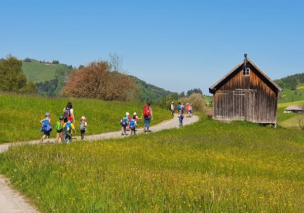 Am Dienstag, dem 01. Juni, fand bei schönstem Wetter die Kindergartenreise statt. Nach einer kurzen Busfahrt ging es los mit der Wanderung. Im schönen Appenzellerland gab es unterwegs vieles zu entdecken. Kurz vor dem Mittag kamen wir bei der Streichelfarm an. Dort konnten wir verschiedene Tiere und deren Zuhause genauer anschauen. Der Besuch bei den Ziegen machte besonders viel Spass. Mutig wagten sich die meisten Kinder, die Tiere zu streicheln und zu füttern. Anschliessend verweilten wir ein wenig auf dem hofeigenen Spielplatz, bevor es dann mit Grillieren losging. Frisch gestärkt mussten wir uns nachher bereits wieder auf den Heimweg begeben. Nun liefen wir bis zum Bahnhof in Gais, wo wir auf das Bähnli und auf eine feine Glace warteten. Zurück ging es wieder mit dem Bus. Glücklich und unheimlich müde wurden die Kinder im Eichberg von den Eltern in Empfang genommen.
