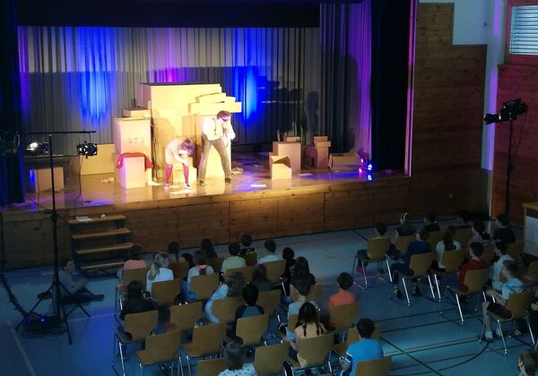 Am Mittwoch, dem 26. Mai, durften die Kinder vom Kindergarten bis zur dritten Klasse eine Theateraufführung des Figurentheaters St. Gallen anschauen. Gespielt wurde das Stück «Die Bremer Stadtmusikanten». Der Esel Rudi, die Katze Mila, der Hund Boris und der Hahn Henning begegnen einander auf der Flucht und beschliessen, nach Bremen zu gehen. Gemeinsam wollen sie dort als Stadtmusikanten auftreten. Die humorvolle und musikalische Darbietung beeindruckte sehr. Es wurde herzhaft gelacht und auch bei der anschliessenden Fragerunde bekundeten viele Kinder ihr Erstaunen über die Leistung der beiden Schauspieler.