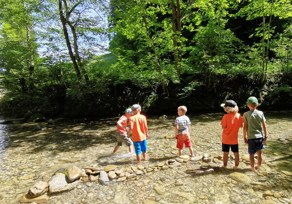 Den Ruchsack mit lauter Leckereien gepackt, den Sonnenhut auf dem Kopf und voller Vorfreude trafen sich die 1. Klasskinder am Dienstagmorgen, 18. Juni 2024 auf dem Pausenplatz. Die Schulreise führte sie mit Bus und Zug ins schöne Appenzellerland. Bei traumhaftem Sommerwetter wanderten die Kinder von Gonten bis nach Jakobsbad. Abseits vom Rummel der Kronberg Talstation im angenehm kühlen, schattigen Wald lag der Mittagsrastplatz. Dort wartete eine Mutprobe auf die hungrigen Wanderer: eine Bachüberquerung. Auch wenn es zuerst Überwindung kostete, war es doch ein gelungenes Abenteuer und eine Wohltat für die erhitzten, müden Füsse. Der märchenhafte Waldplatz direkt am Bach regte zum Entdecken, Bauen, Klettern und Plantschen ein. Aber auch für das Plündern des Rucksacks blieb genügend Zeit, bis sich die Klasse wieder auf den Heimweg machte - mit dem Zug von Jakobsbad zurück ins Rheintal.