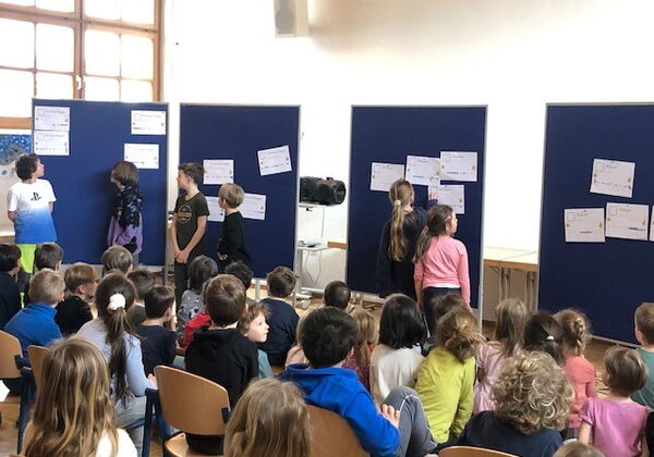 Am 04. April versammelten sich alle Klassen vom Kindergarten bis zur 6. Klasse zum gemeinsamen Schultreffen, unserem PowWow. Nach einer Begrüssung und einiger Informationen durch die Schulleitung, präsentierten die Vertreterinnen und Vertreter des Schulhausrates die Auswertung zur Umfrage "Umsetzung unserer Schulhauswerte". Bei der Präsentation anhand der Klebepunkte zeigten die Kinder deutlich auf, dass wir bereits viele unserer Schulhauswerte gut bis sehr gut umsetzen. Bei vereinzelten Werten gibt es aber noch grosse Unterschiede in den Klassen, so dass es weiterhin wichtig ist, die gemeinsam formulierten Ziele weiterhin fleissig zu trainieren und umzusetzen. Im Anschluss übten alle Kinder unter der Leitung von Frau Wüthrich den neu komponierten Schulhaussong ein. In diesem Lied vertexten die Lehrpersonen viele Ideen der Kinder, was unsere Schule eben einzigartig macht. Wir freuen uns schon riesig, unseren Schulsong am Eichberger Gesangsfest vom 01. Juni aufführen zu dürfen.