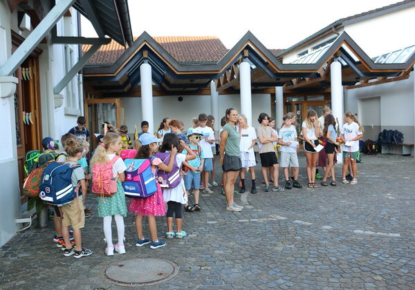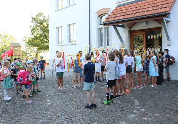 Am Montag, 12.08.2024 standen Lehrpersonen und Schüler:innen Spalier für unsere neuen 1. Klässler:innen um sie herzlich in der Schule zu begrüssen. Nach dem gemeinsamen Schullied überreichten die Kinder der 6. Klasse eine selbstgestaltete Überraschung, was für ein toller Schulstart.